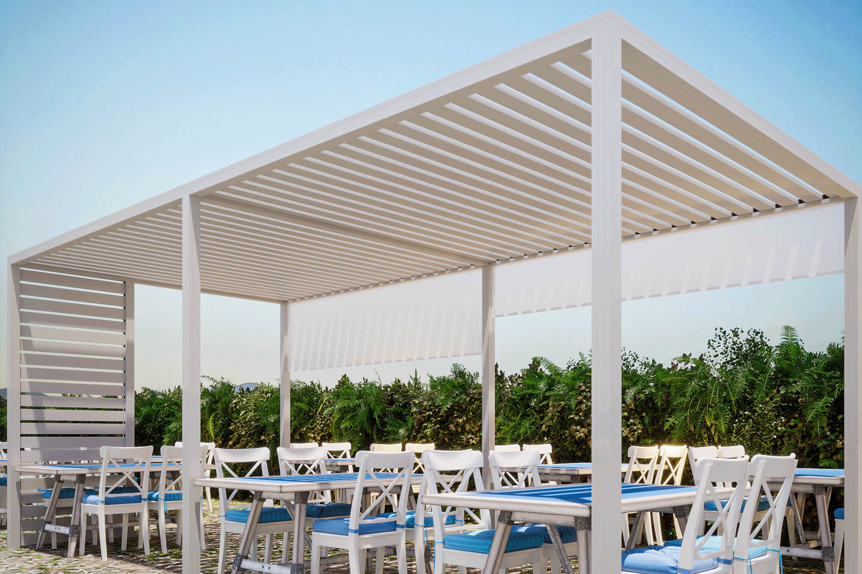 - Louvres can be placed in a fixed position for full shading or tilted to the desired angle for controlled ventilation and partial shading, effectively extending your outdoor space for year-round use.